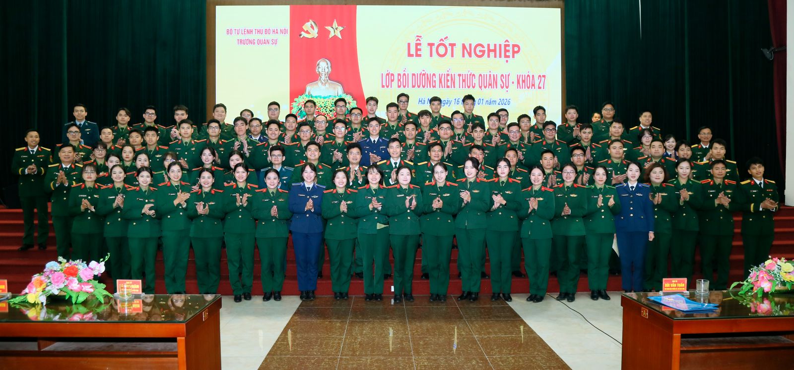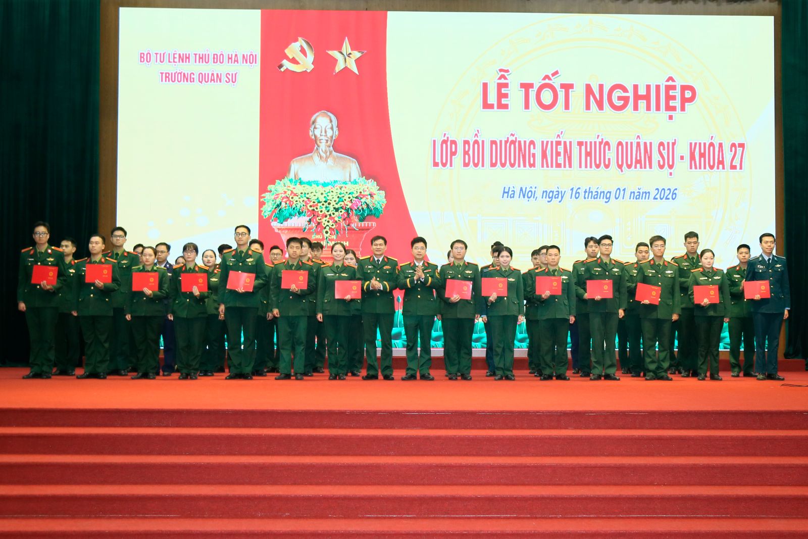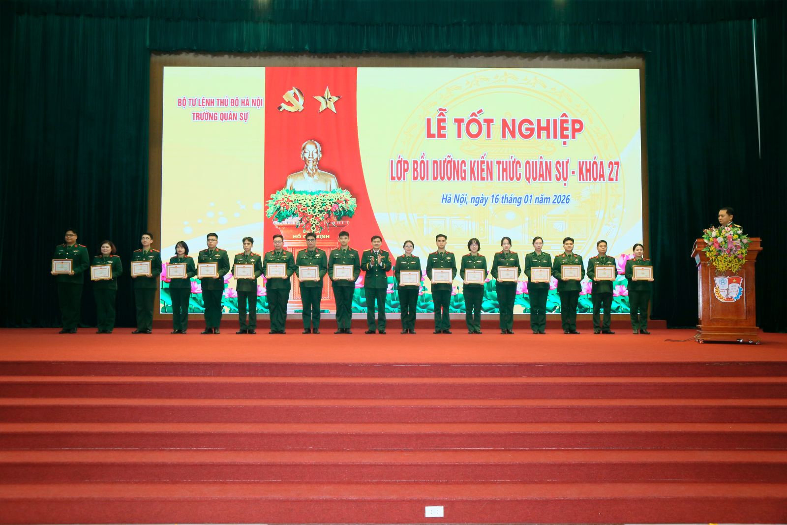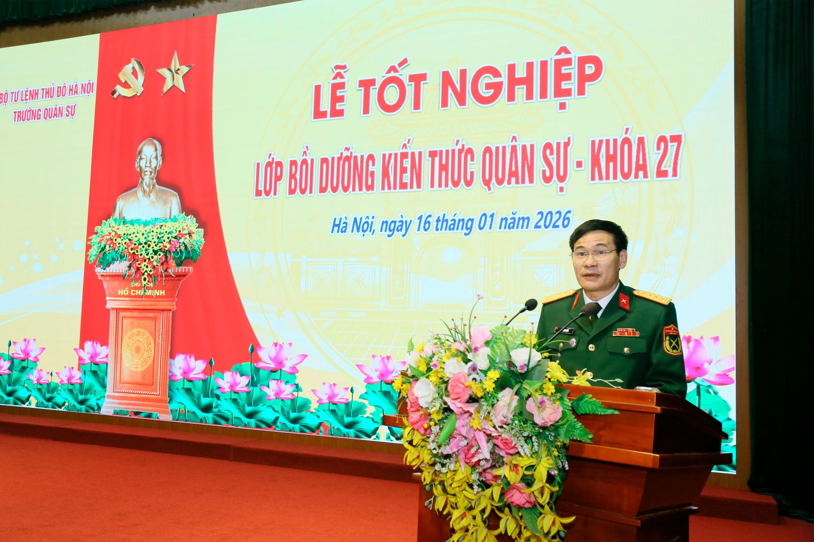 Phát biểu chỉ đạo tại buổi lễ, Đại tá Bùi Văn Tuấn - Phó Tham mưu trưởng BTL Thủ đô Hà Nội ghi nhận, biểu dương những kết quả mà Trường Quân sự Bộ Tư lệnh Thủ đô Hà Nội đã đạt được năm học vừa qua; trong đó khẳng định lớp Bồi dưỡng kiến thức quân sự khóa 27 được tổ chức đúng kế hoạch, hoàn thành toàn diện mục tiêu, yêu cầu đề ra và đạt chất lượng tốt. Đồng chí yêu cầu Nhà trường tiếp tục rút kinh nghiệm, nâng cao chất lượng giáo dục, đào tạo, bảo đảm an toàn trong huấn luyện; đề nghị các học viên sau khi tốt nghiệp phát huy kết quả học tập, vận dụng hiệu quả kiến thức đã được học vào thực tiễn công tác, góp phần xây dựng cơ quan, đơn vị vững mạnh toàn diện, hoàn thành tốt nhiệm vụ được giao.