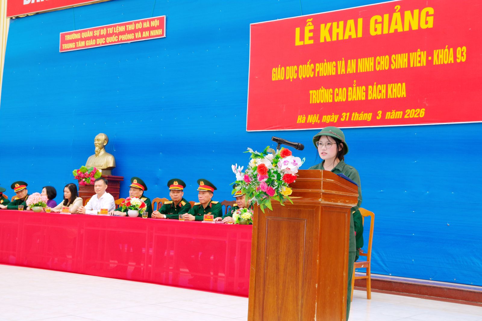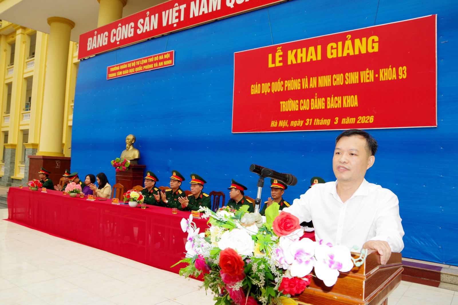* Thay mặt Ban Giám hiệu Trường Cao đẳng Bách Khoa, Thạc sĩ Nguyễn Thanh Mai phát biểu bày tỏ sự trân trọng và cảm ơn sâu sắc tới Trung tâm Giáo dục quốc phòng và an ninh, Trường Quân sự Bộ Tư lệnh Thủ đô Hà Nội. Đồng chí chia sẻ niềm vui khi ngay từ những ngày đầu nhập học, sinh viên đã có sự chuyển biến tích cực, rõ nét về nền nếp, tác phong, trang phục cũng như trật tự nội vụ.