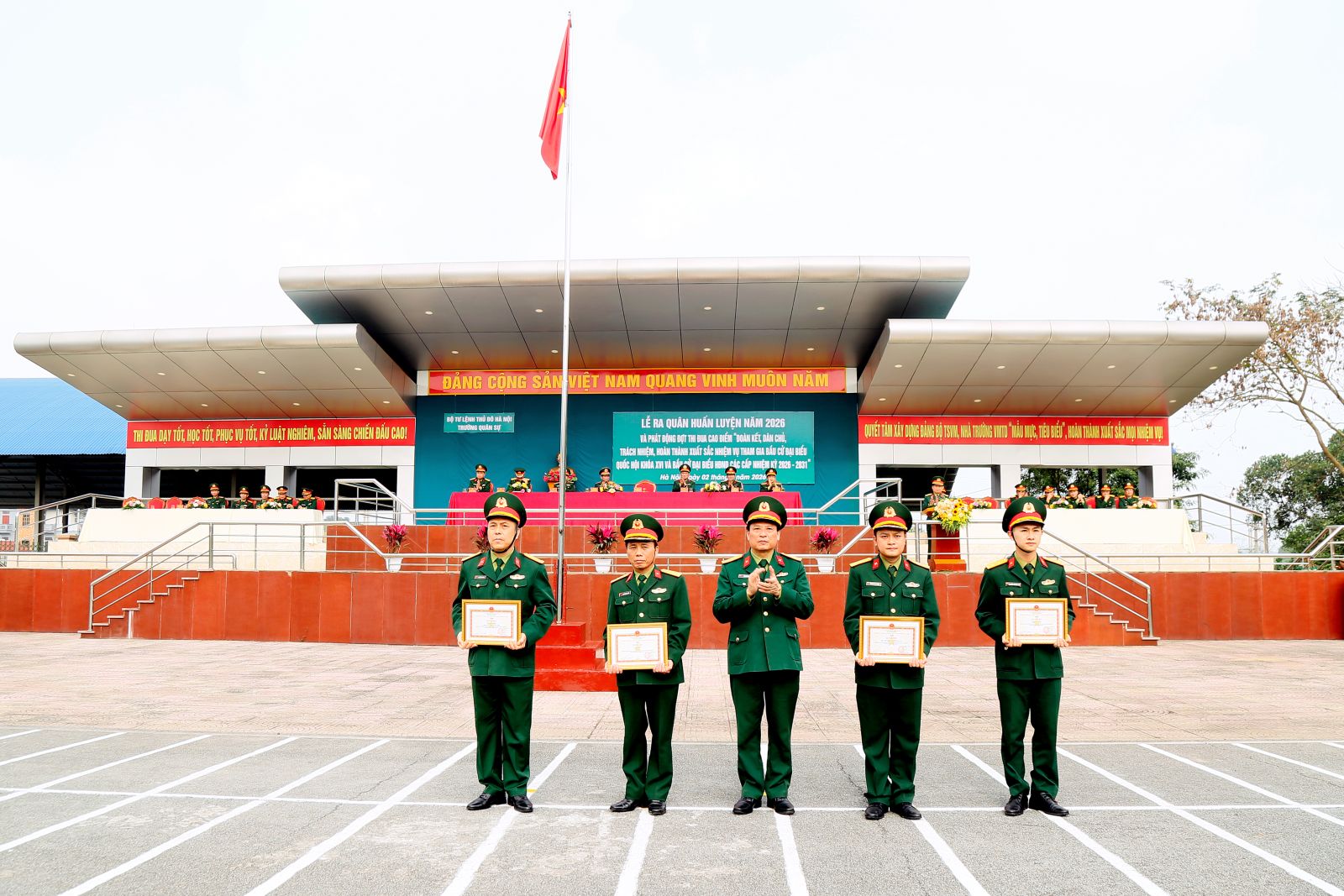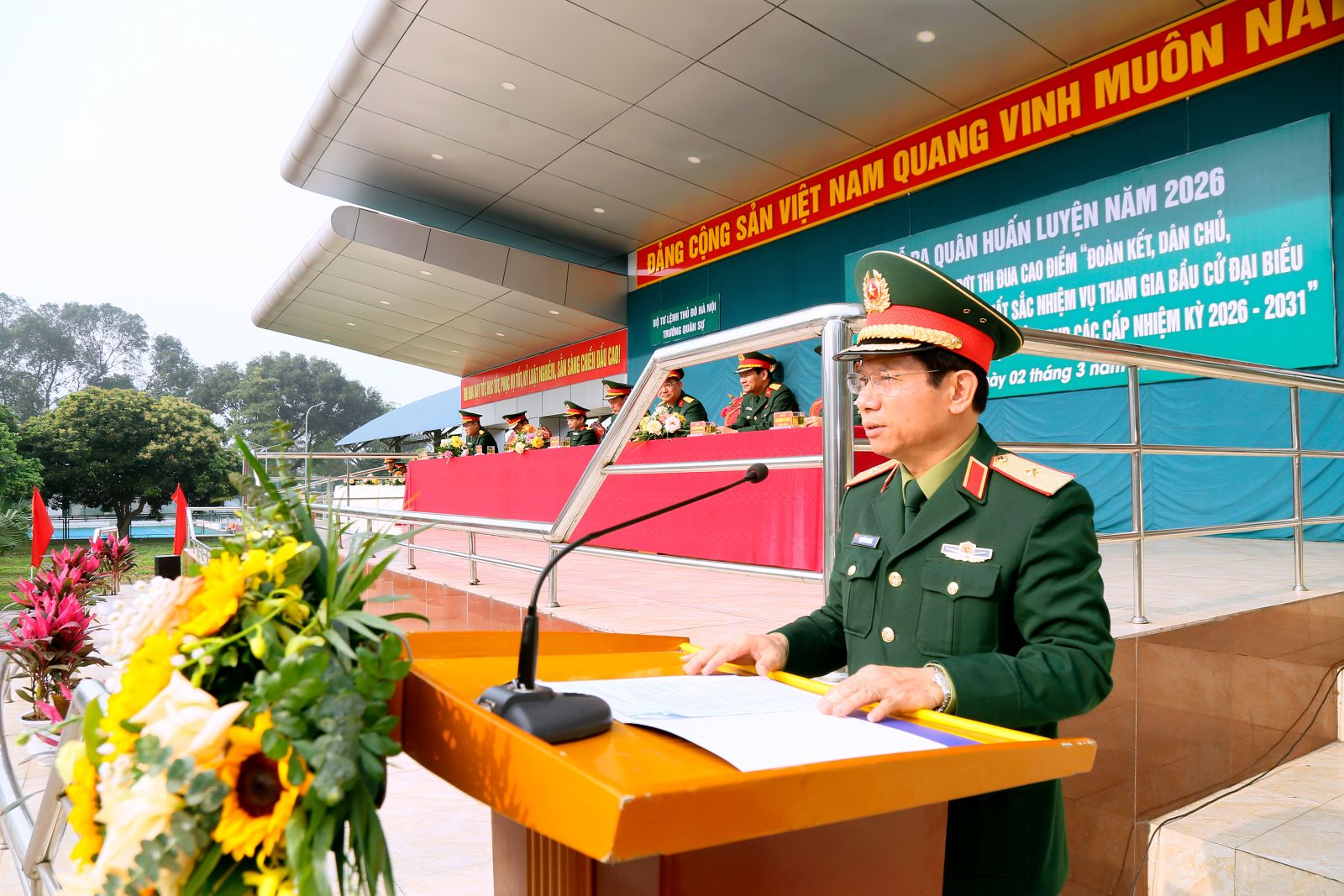Cũng tại buổi Lễ, Đại tá Trịnh Đình Đông – Bí thư Đảng ủy, Chính ủy Nhà trường đã phát động phong trào thi đua trong huấn luyện năm 2026 với chủ đề “Huấn luyện giỏi, đoàn kết tốt, kỷ luật nghiêm, sẵn sàng chiến đấu cao, an toàn tuyệt đối” (thời gian thực hiện từ 01/3 đến kết thúc nhiệm vụ huấn luyện) và đợt thi đua cao điểm với chủ đề: “Đoàn kết, dân chủ, trách nhiệm, hoàn thành xuất sắc nhiệm vụ tham gia bầu cử đại biểu Quốc hội khóa XVI và bầu cử đại biểu HĐND các cấp nhiệm kỳ 2026-2031” (thời gian thực hiện từ 02/3 đến 19/5/2026).
