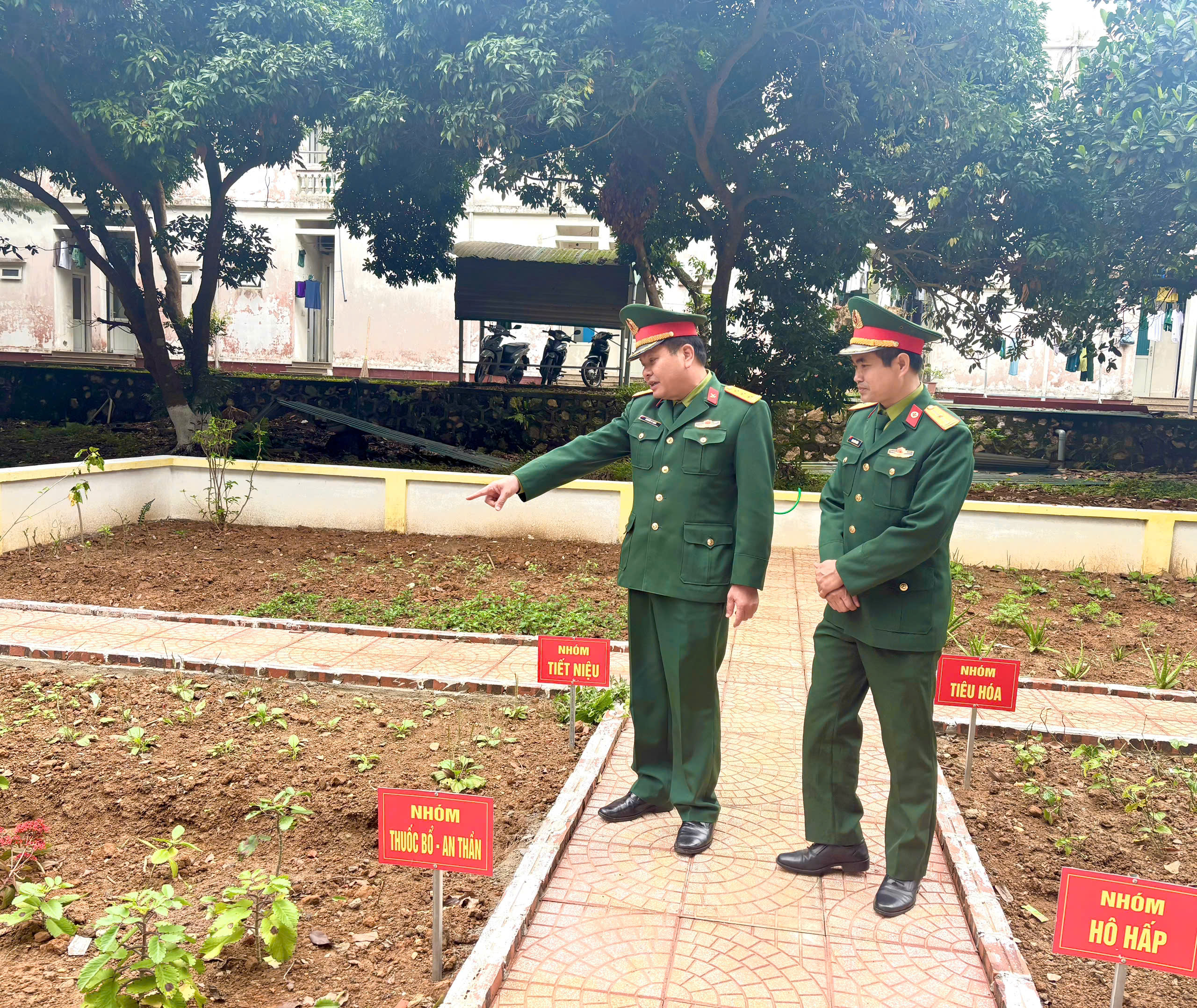 Vườn thuốc được xây dựng với diện tích ~200m2, trồng 41 loại cây theo 10 nhóm thuốc theo Cục Quân y, Tổng cục Hậu cần-Kỹ thuật hướng dẫn, gồm: Cảm cúm, Tiêu hóa, Hô hấp, Tiêu độc, Ngoài da, Cấp cứu rắn cắn, Bổ-An thần, Khớp, Cầm máu, Tiết niệu.